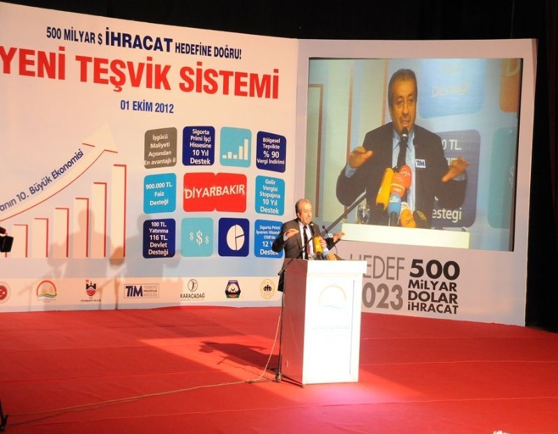 The Governor of Diyarbakır Mustafa Toprak, the President of Turkey Exporters Assembly Mehmet Büyükekşi, Parliament Members from Diyarbakır Galip Ensarioğlu, Süleyman Hamzaoğulları, Mine Lök Beyaz, Cuma İçten, Oya Eronat, Rector of the Dicle University Prof. Ayşegül Jale Saraç, the Secretary General of Karacadağ Development Agency İlhan Karakoyun, President of the Diyarbakır Commodity Exchange Fahrettin Akyıl, Deputy Governors of Diyarbakır Cemal Hüsnü Kansız, Zafer Ergin and other governors and large number of industrialists and businessmen were also attended to the meeting held in Cahit Sıtkı Tarancı Cultural Center.President of the Diyarbakır Commodity Exchange Fahrettin Akyıl and President of the Diyarbakır Chamber of Commerce Remzi Can said “We are waiting investors to Diyarbakır” as first speakers of the meeting.President of the Turkey Exporters Assembly (TIM) Mehmet Büyükekşi explained export figures in his speech. And he continued: “In 2011, Diyarbakır with 170 million dollars export became 35’th province in export ranking. In the first 9 months of 2012, it reached to 143 million dolars export by 24 percent increase. We believe that Diyarbakır has much higher export potential.” He also declared national export figures of September: “In September, exports increased by 7,4 percent compared to the same month last year to 11,408 billion dollars. And first 9 months of the year by 12,1 percent increase it reached to 111,463 billion dollars.”After Büyükekşi’s speech the Governor of Diyarbakır Mustafa Toprak emphasized advantages of Diyarbakır by the new incentive system. M. Mehdi Eker, the Minister of Food Agriculture and Livestock, said that this meeting was indicator of the importance of Diyarbakır for TİM. Zafer Çağlayan, the Minister of Economy, said: “Turkey is going through a unprecedented success process”. And also he said that they made positive discrimination to the 6’th region in the new incentive system.After the speeches, Zafer Çağlayan, the Minister of Economy and M. Mehdi Eker, the Minister of Food Agriculture and Livestock, were presented plaques to authorities of exporting firms in the top 10 list in 2011.